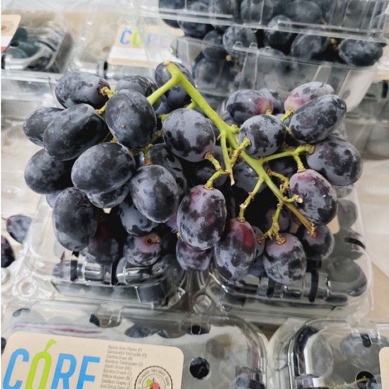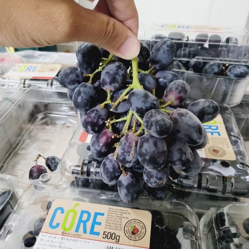 Nho Đen Nam Phi (Core) là loại nho không hạt, vỏ ngoài bóng bẩy, quả tròn nhỏ, vỏ mỏng, lớp thịt mềm và có độ ngọt vừa phải, hậu không chua, không chát vỏ, hàng theo chùm chuỗi khá bắt mắt.