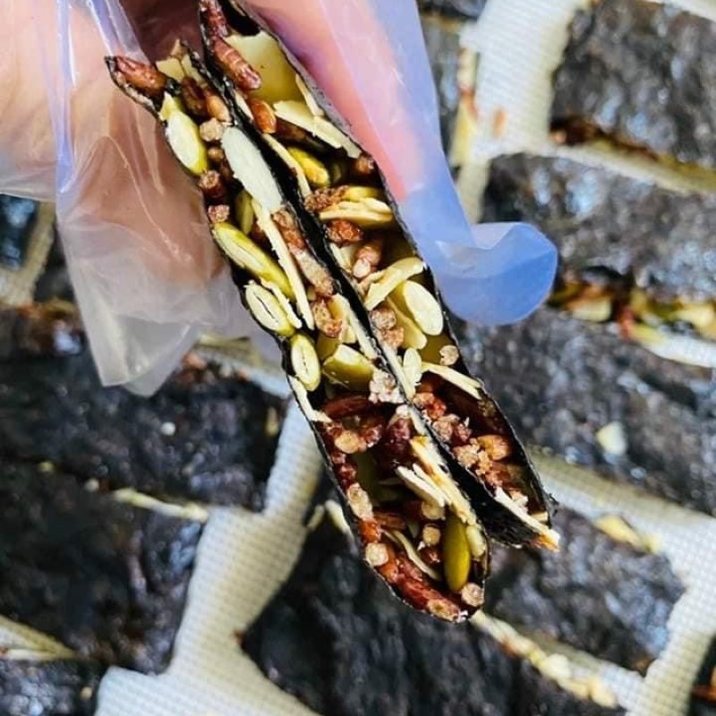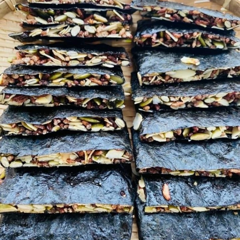 Rong biển kẹp hạt là món ăn vặt có giá tri dinh dưỡng cao, không những thơm ngon, dễ ăn mà lại cực kỳ tốt cho sức khỏe. Món ăn có lớp vỏ ngoài giòn rụm, nhân hạt thì bùi bùi được tẩm ướp gia vị vừa ăn, kết hợp với lớp nhân beo béo từ các loại hạt dinh dưỡng mang lại một hương vị vô cùng hài hoà, ngoài ra còn phù hợp với người ăn thuần chay nhờ cung cấp đầy đủ các chất dinh dưỡng cần thiết cho 1 ngày dài.
